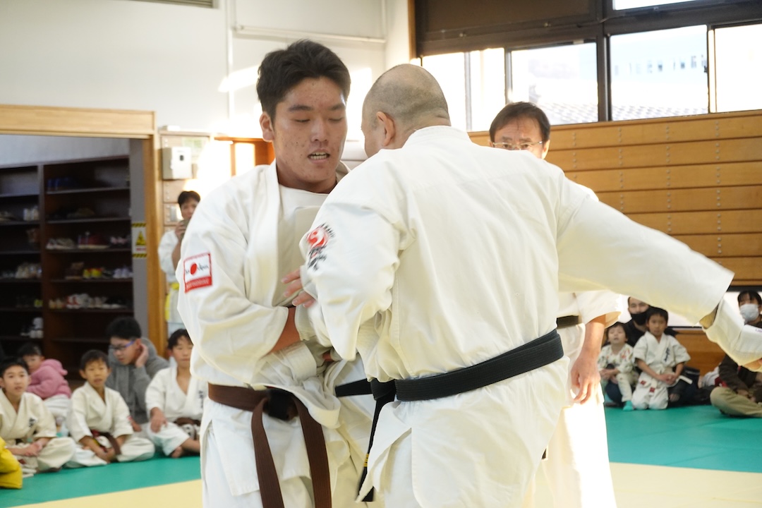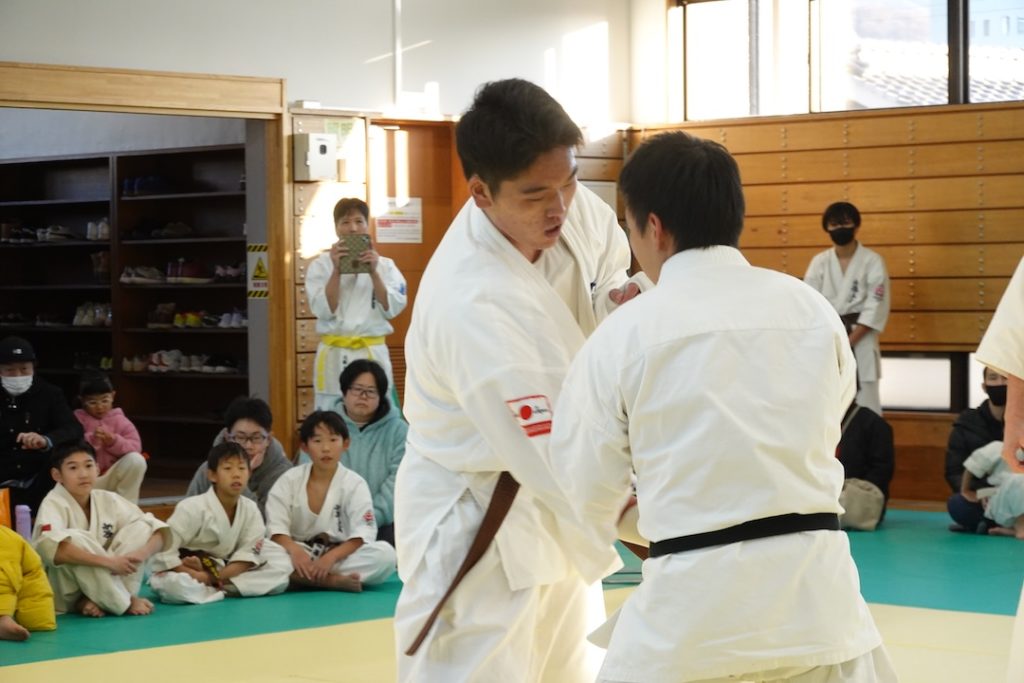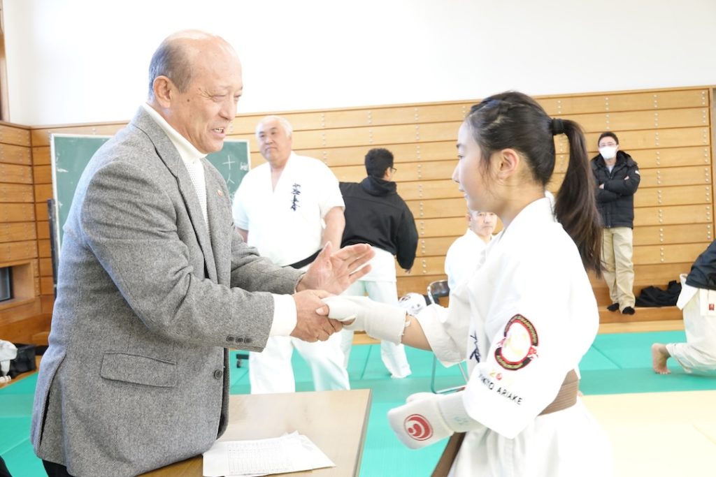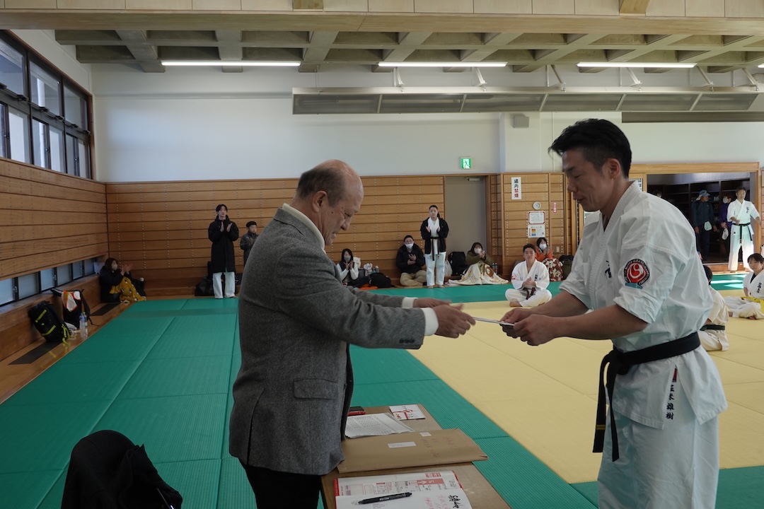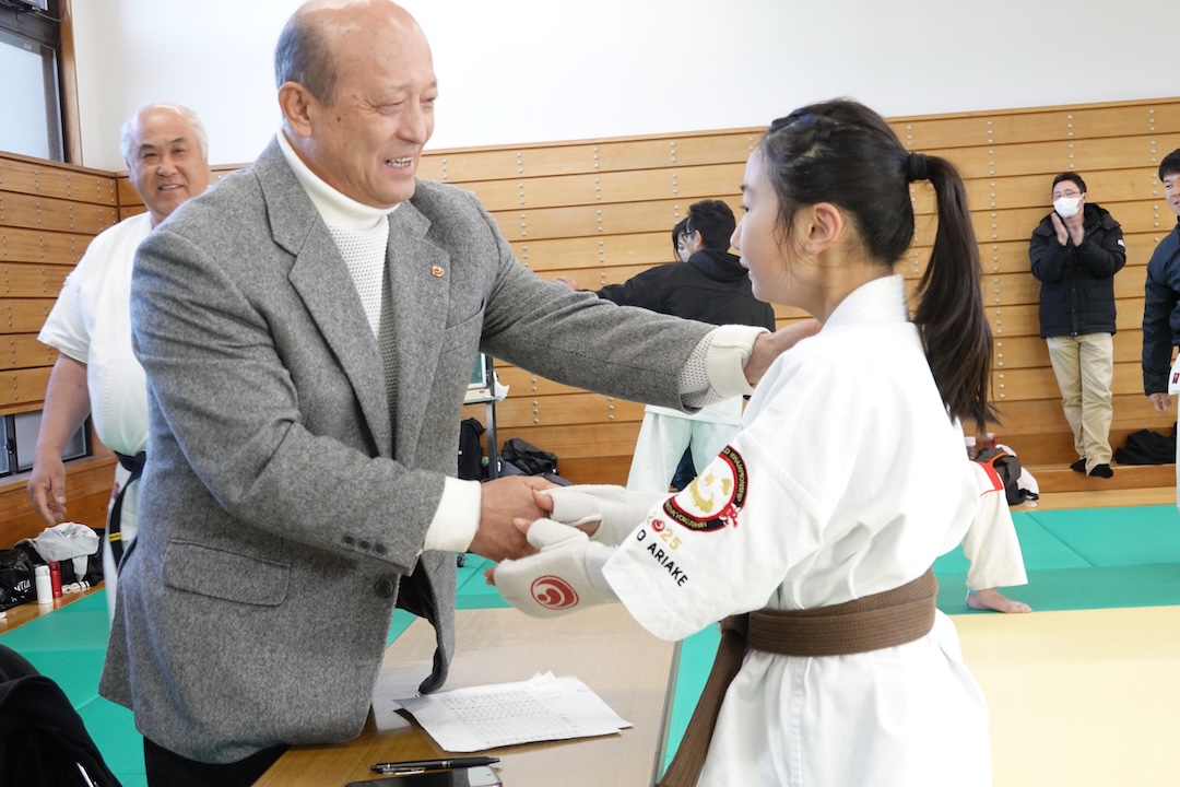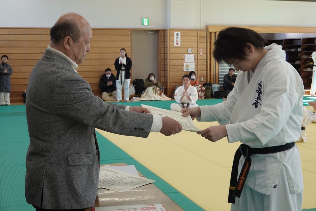 今回の審査では、一般の試合にも挑戦し、ドリームフェスティバル高校生重量級の部で準優勝された藤森玄毅(高3)、同じくドリームフェスティバル型部門で3位入賞された竹内碧(小5)が昇段(初段)に挑戦しました。