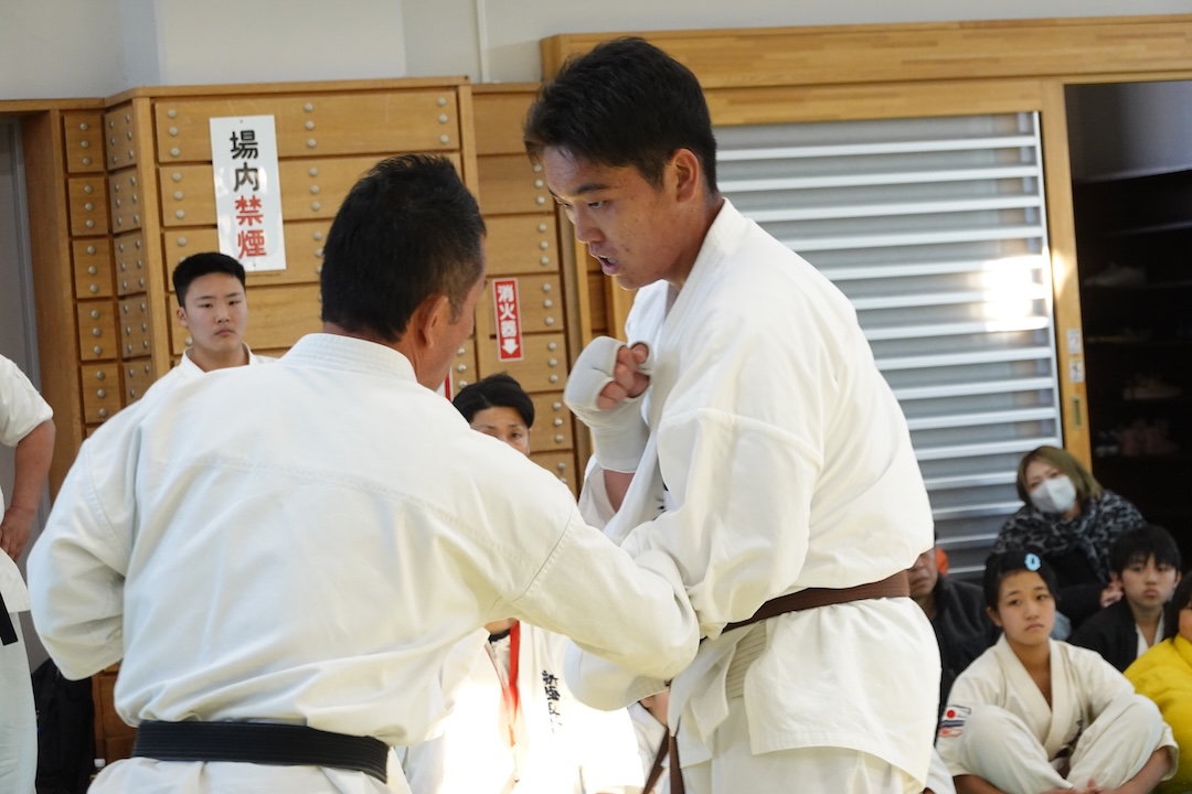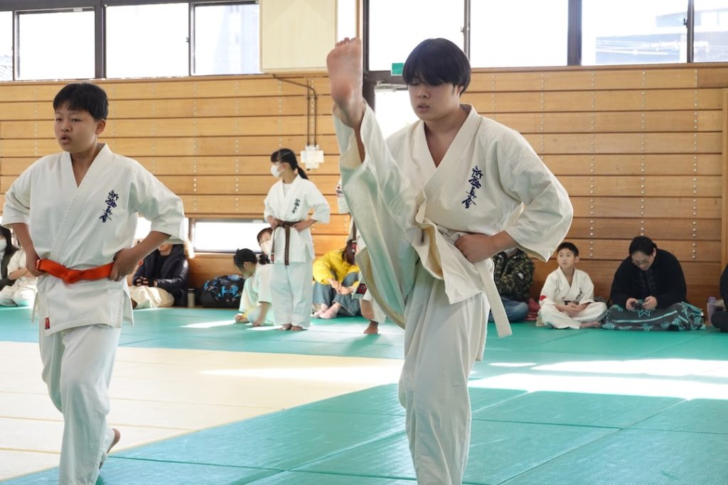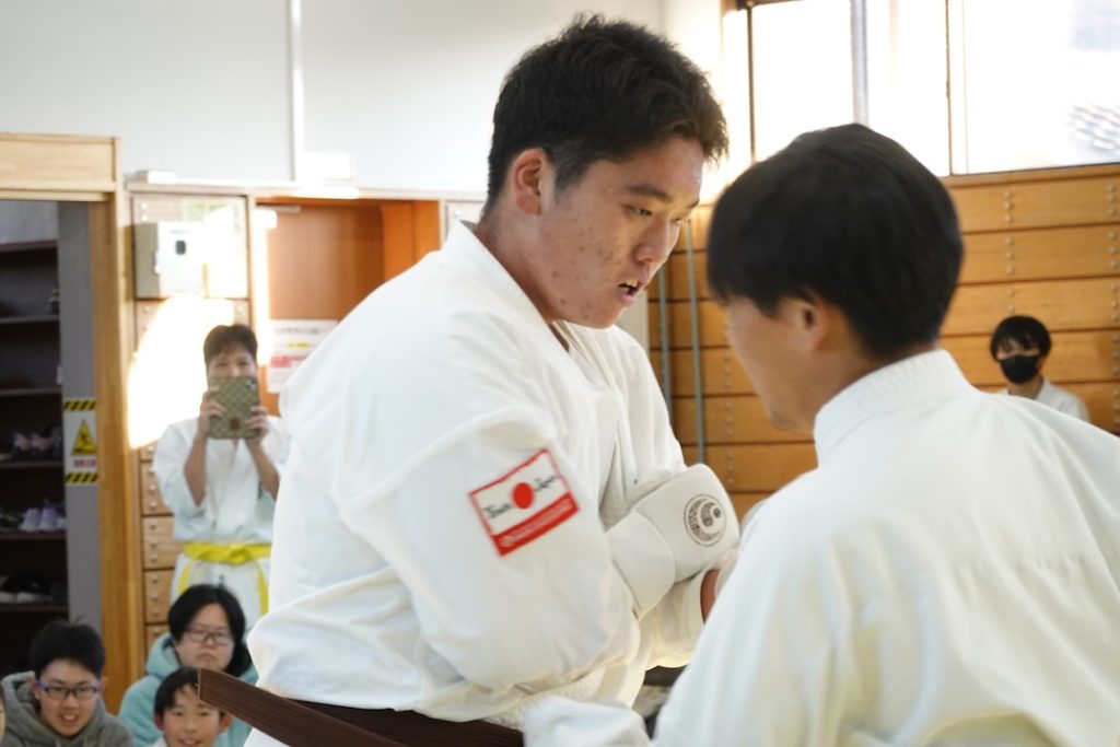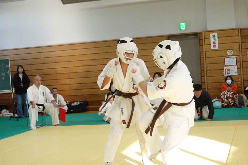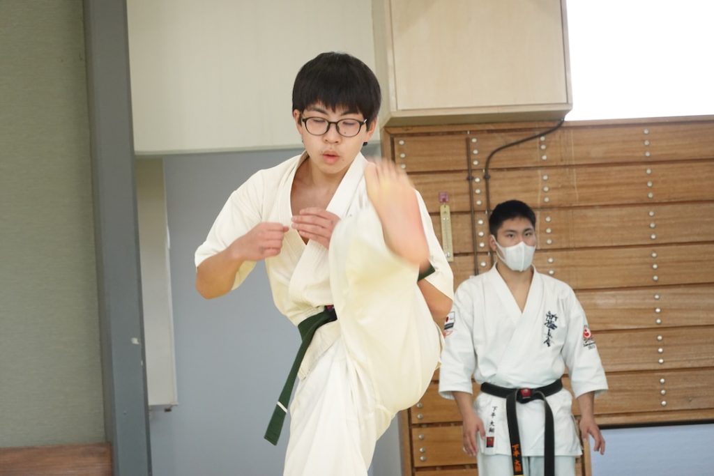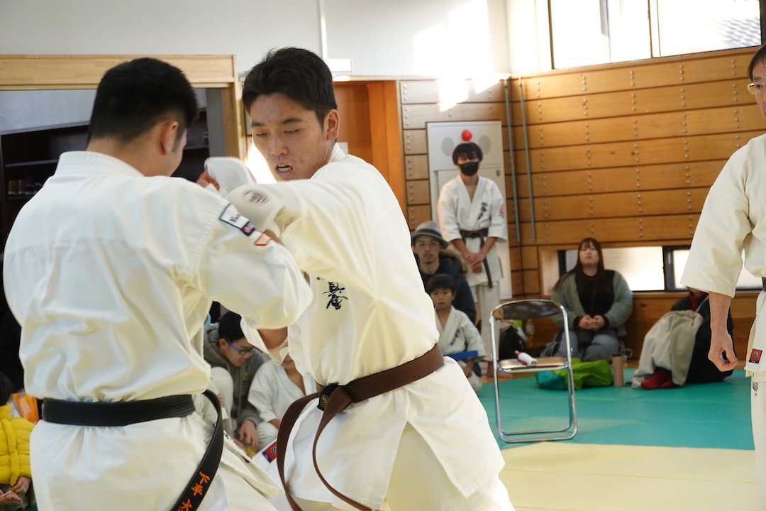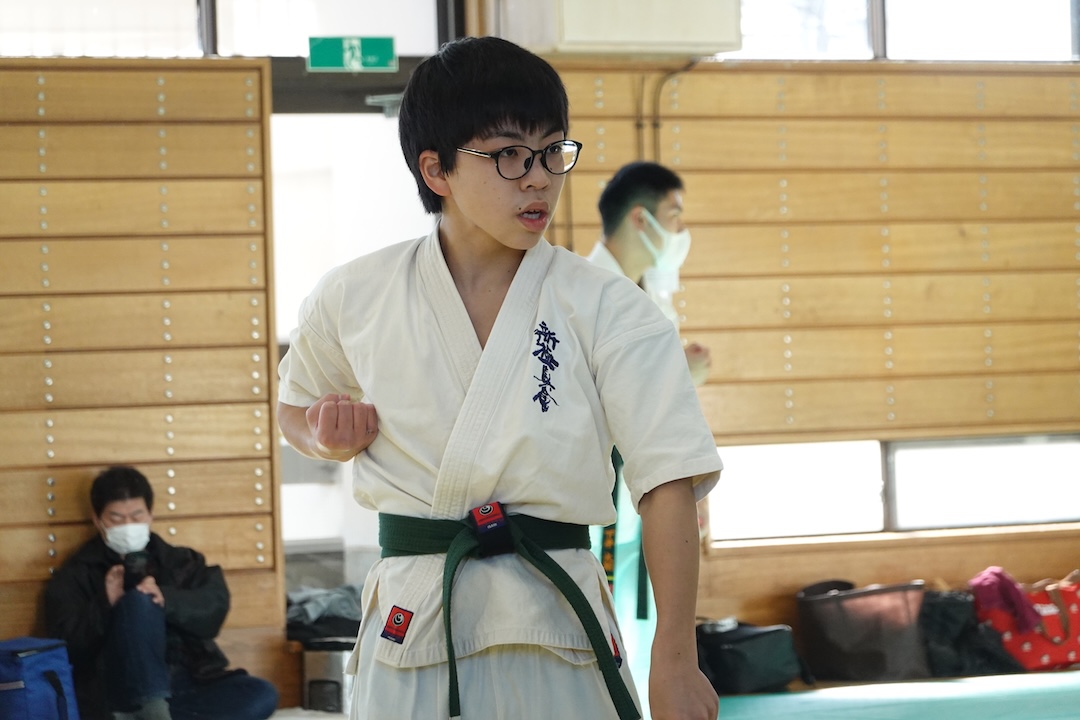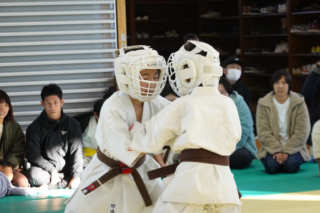 二人は日々の稽古の成果を存分に発揮、藤森玄毅は重量級らしい重厚な組手で、竹内碧は十分なスタミナを活かし、手数、足を最後まで止めることなく10人組手を完遂しました。
