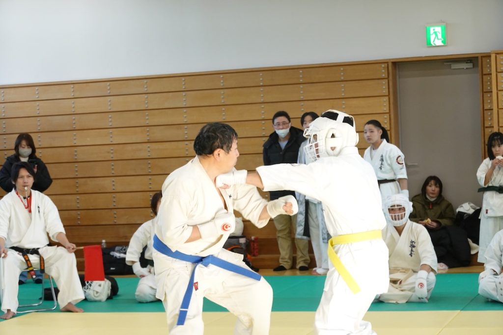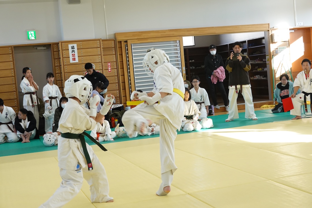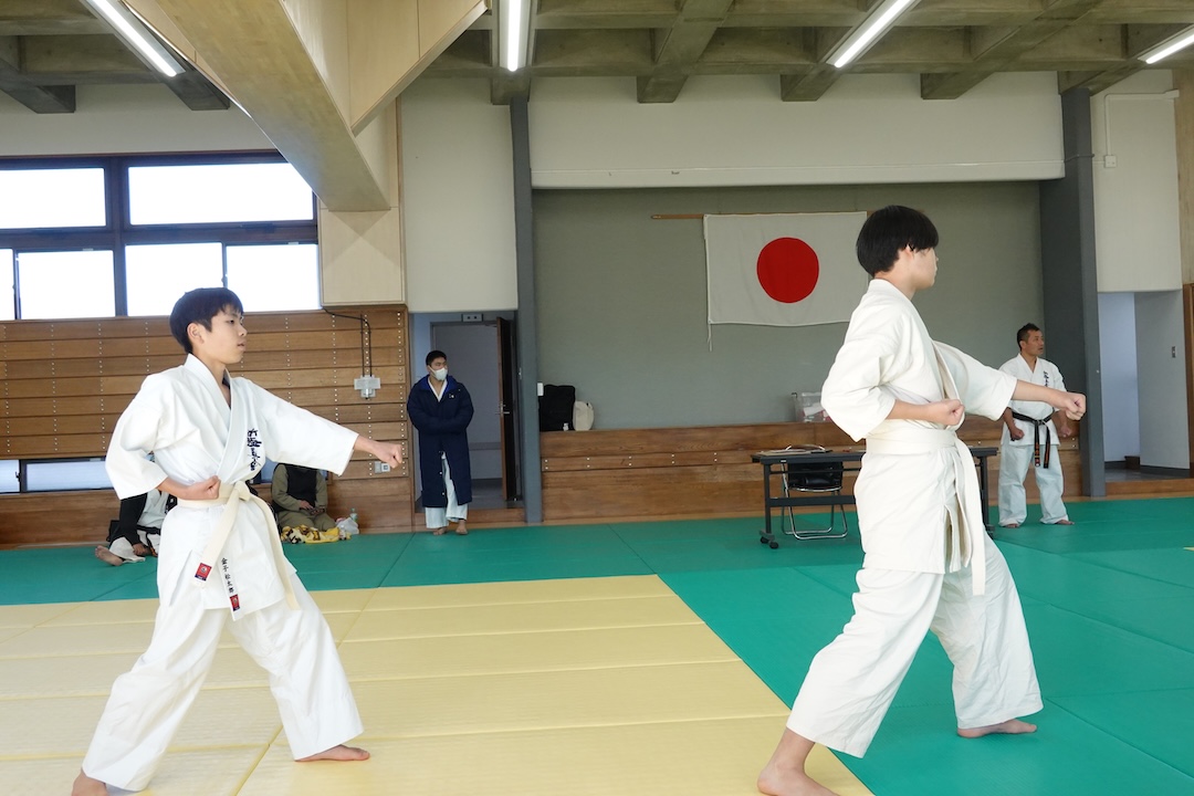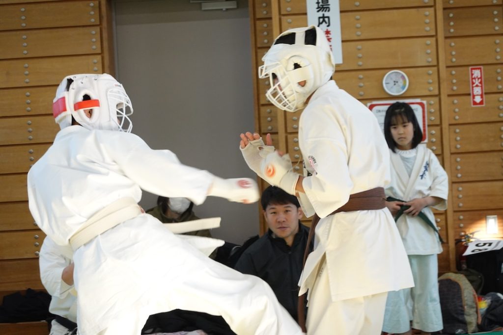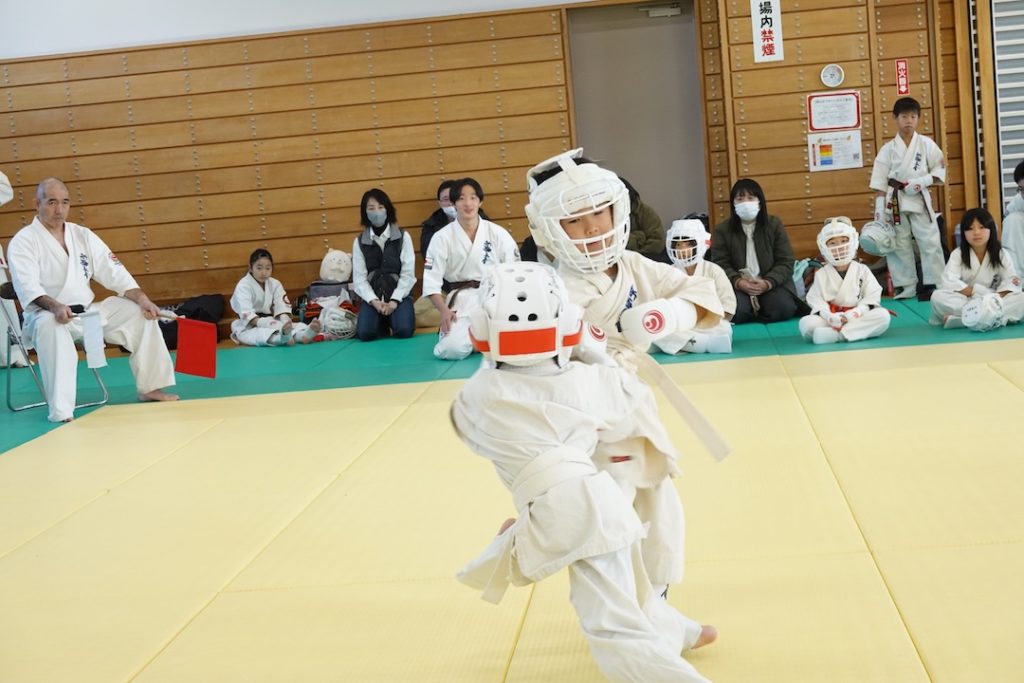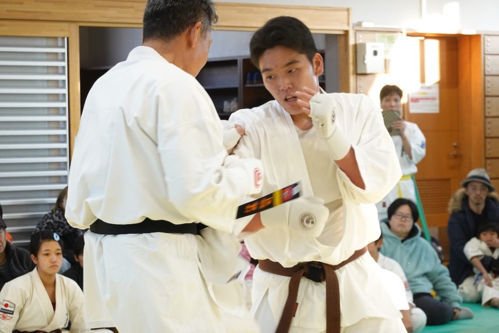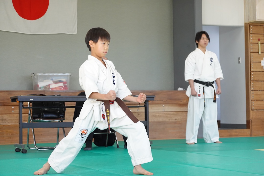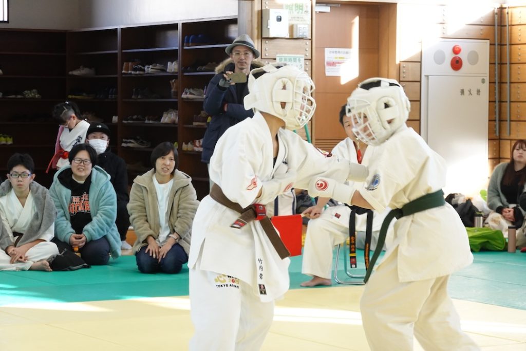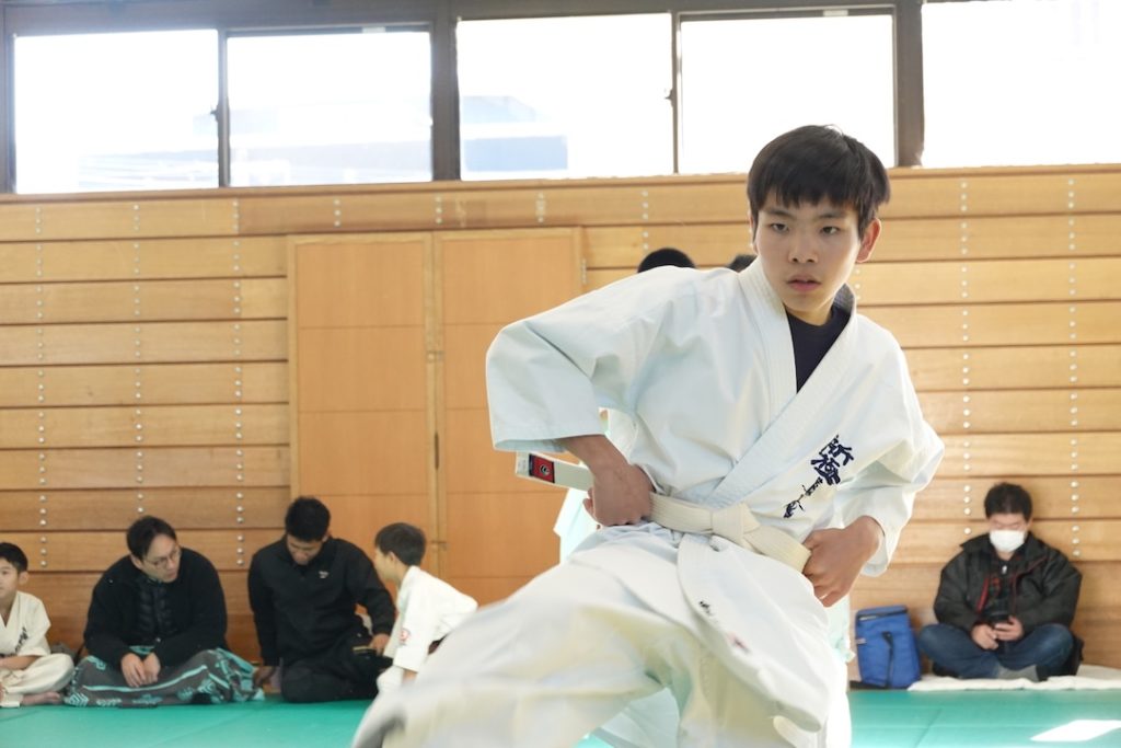 二人は日々の稽古の成果を存分に発揮、藤森玄毅は重量級らしい重厚な組手で、竹内碧は十分なスタミナを活かし、手数、足を最後まで止めることなく10人組手を完遂しました。
