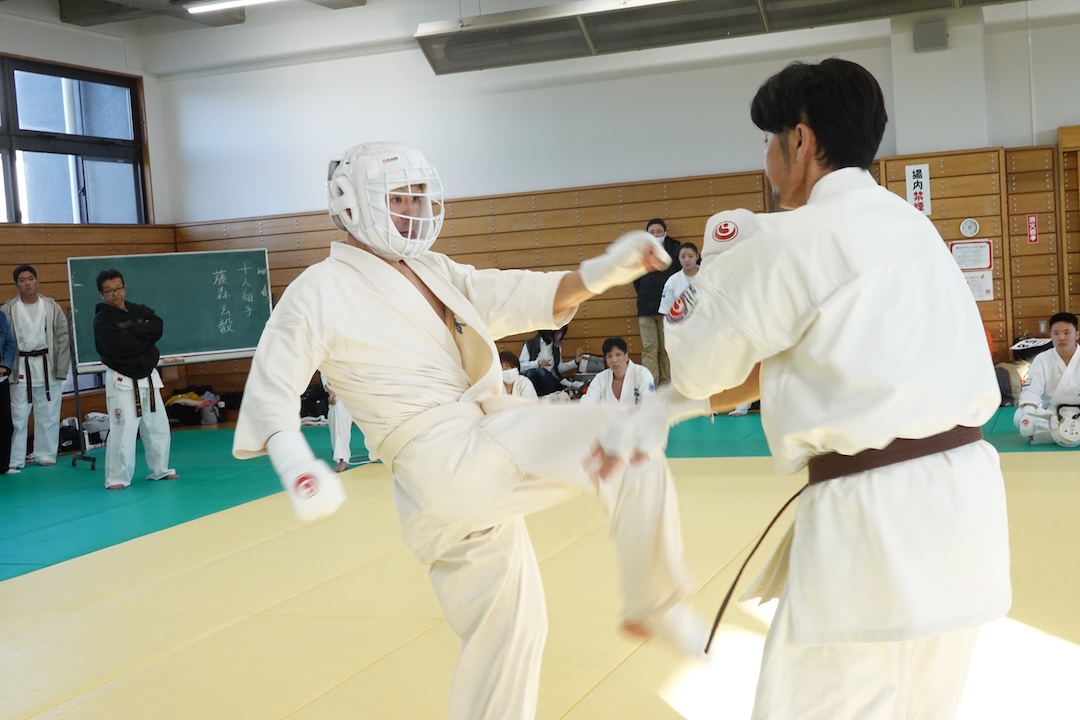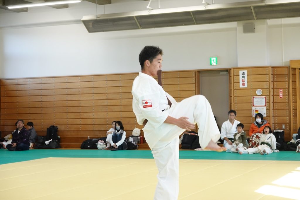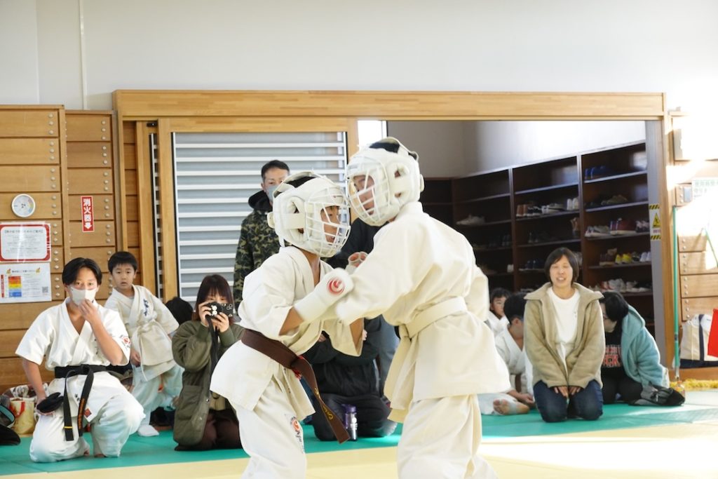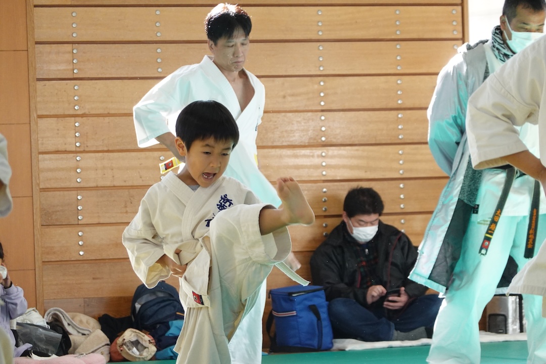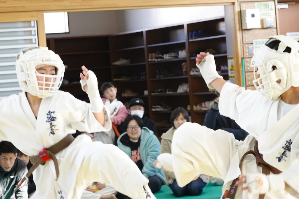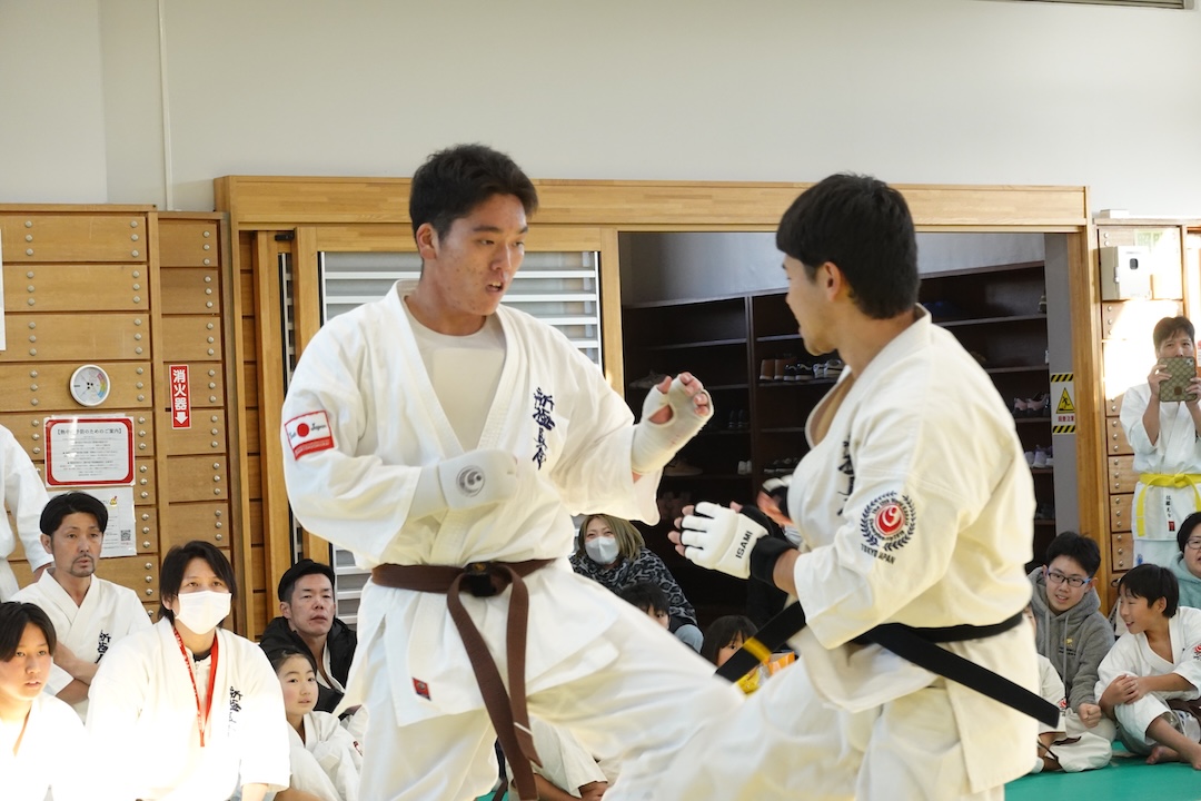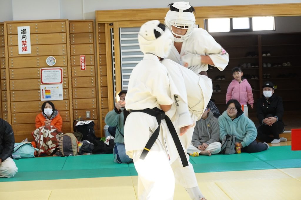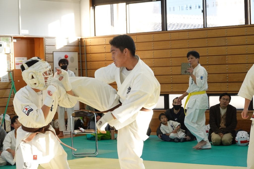 二人は日々の稽古の成果を存分に発揮、藤森玄毅は重量級らしい重厚な組手で、竹内碧は十分なスタミナを活かし、手数、足を最後まで止めることなく10人組手を完遂しました。