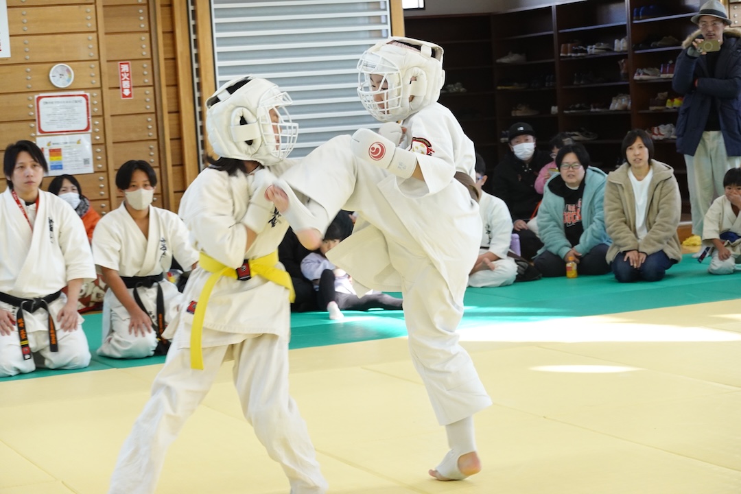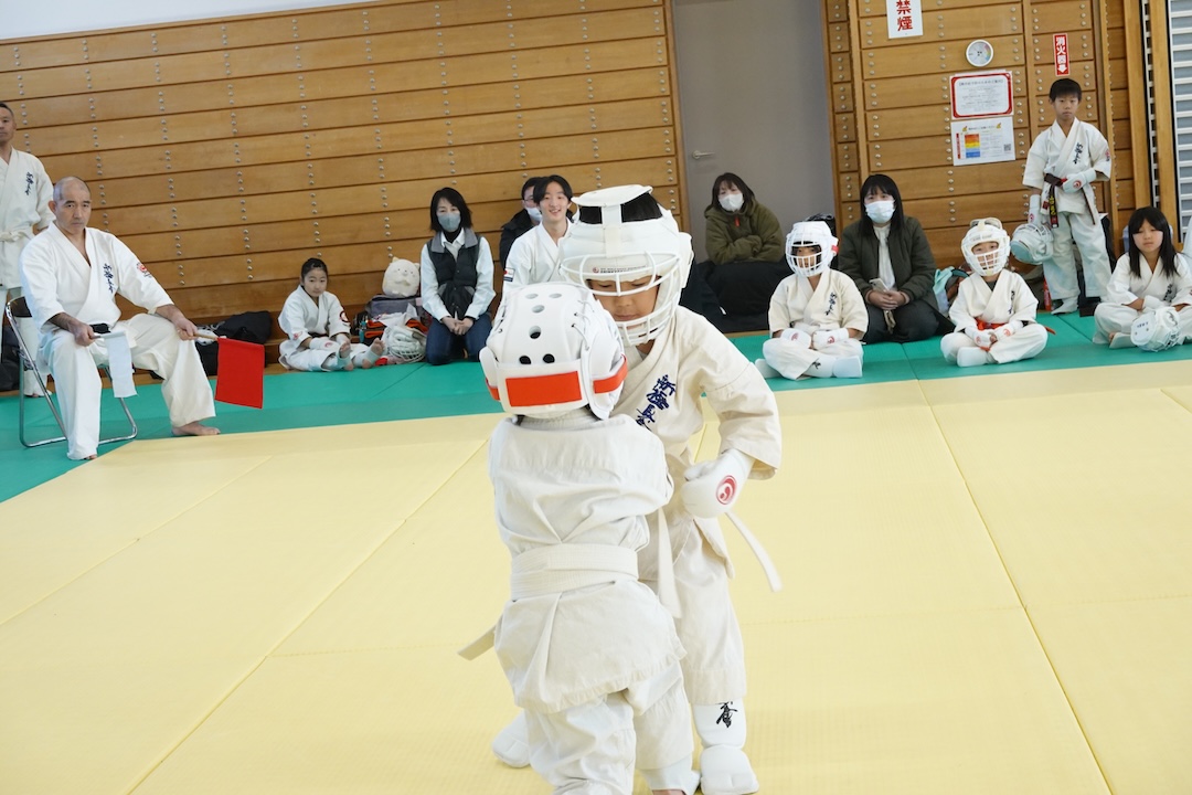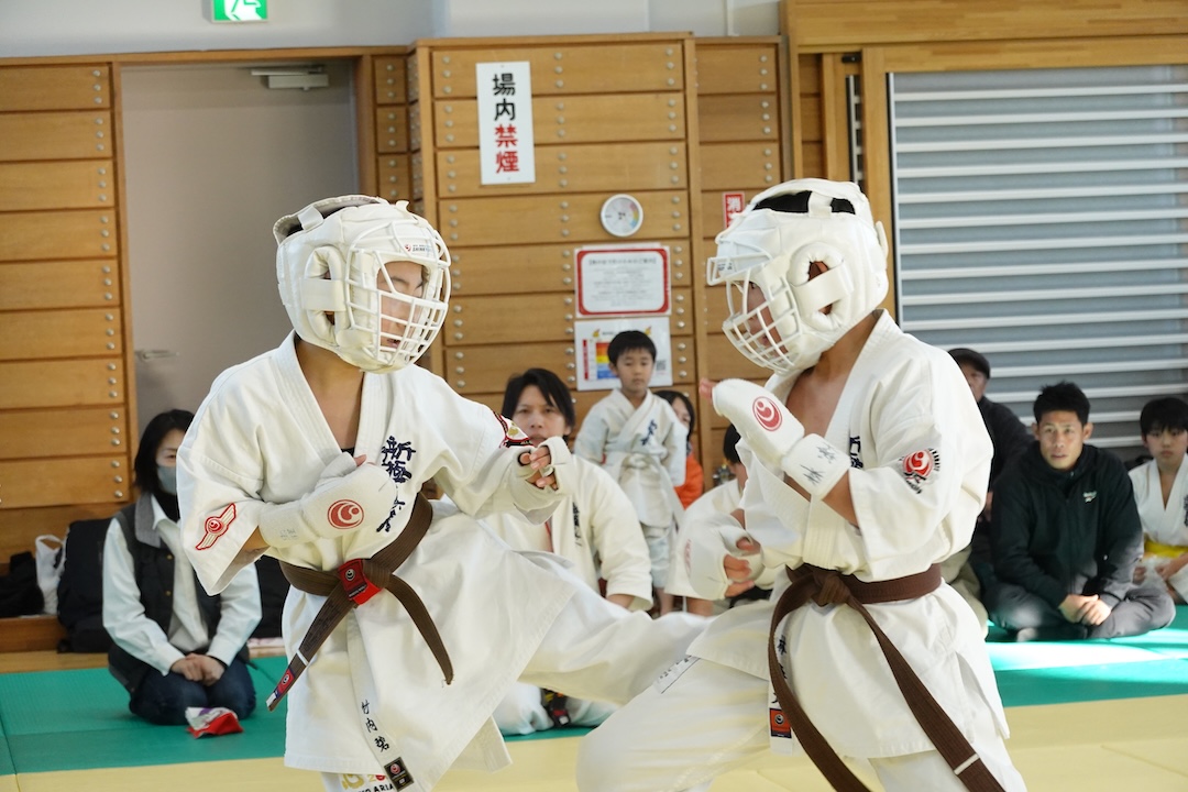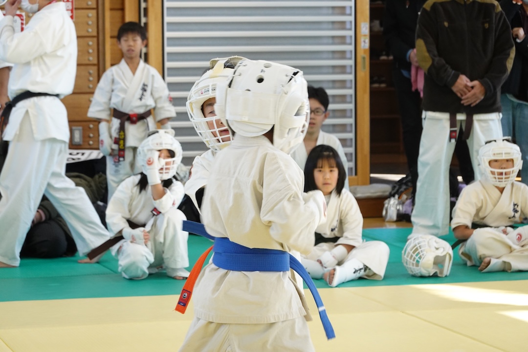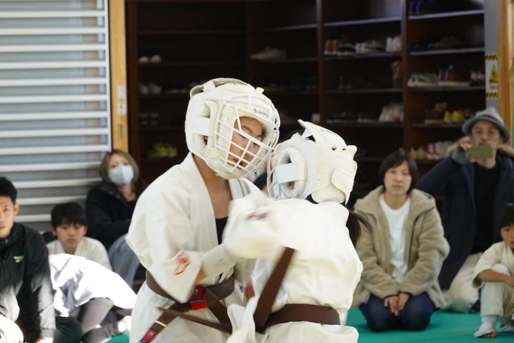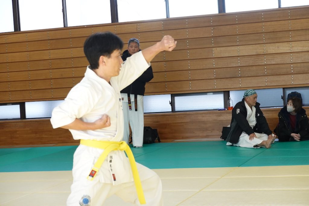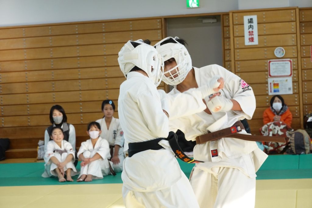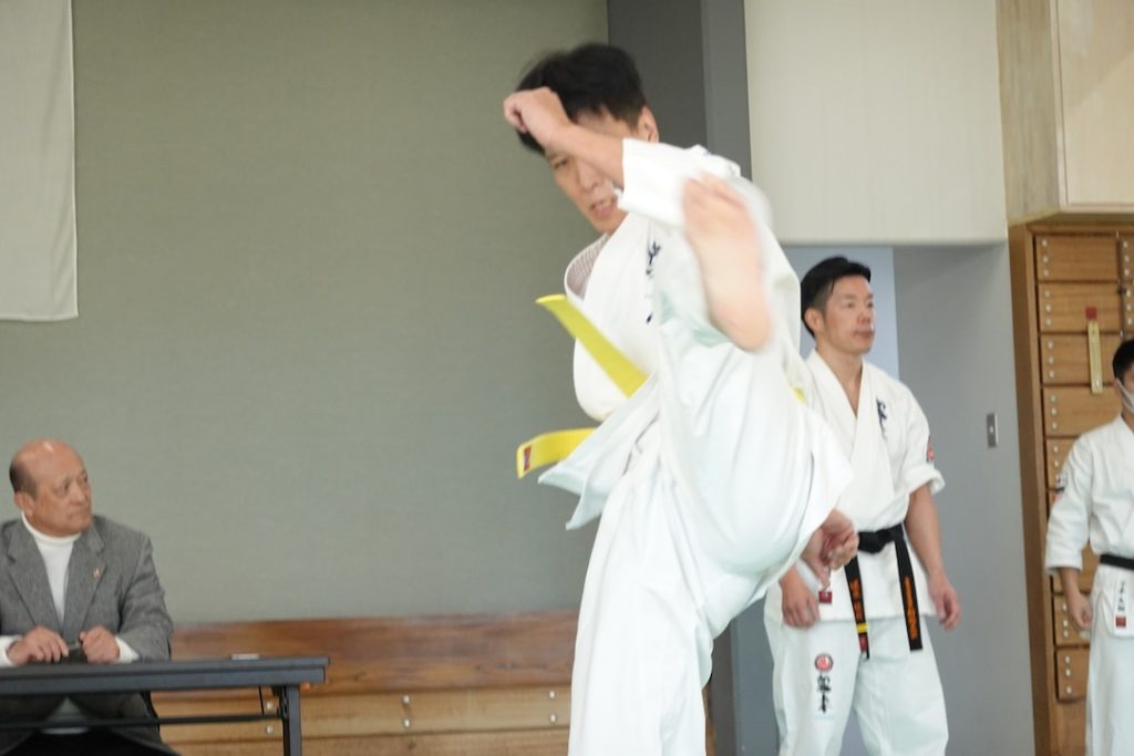 二人は日々の稽古の成果を存分に発揮、藤森玄毅は重量級らしい重厚な組手で、竹内碧は十分なスタミナを活かし、手数、足を最後まで止めることなく10人組手を完遂しました。