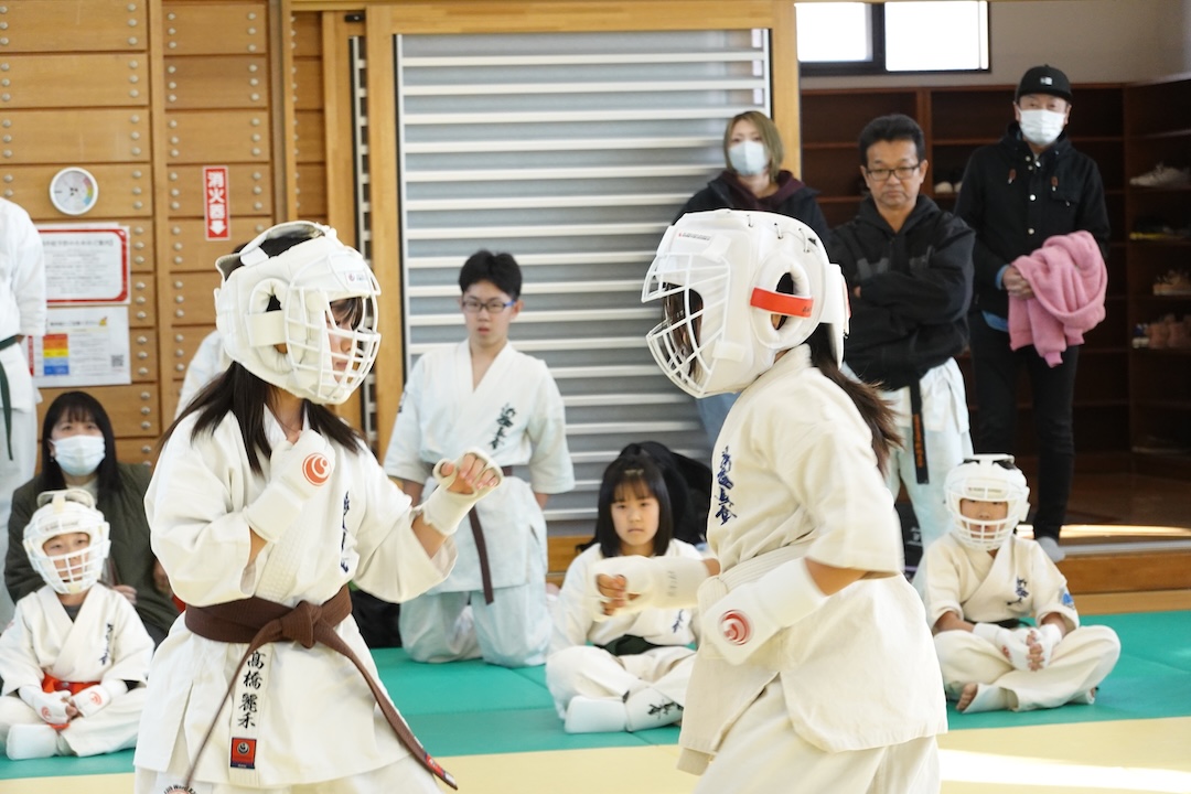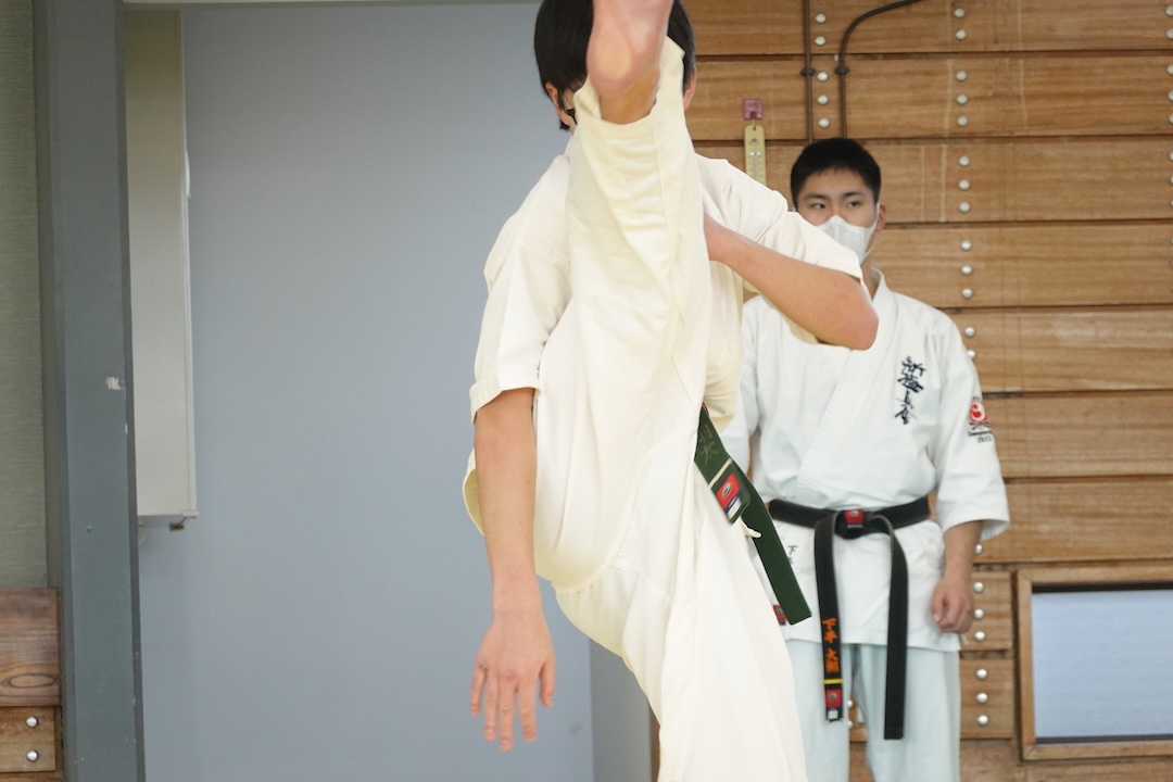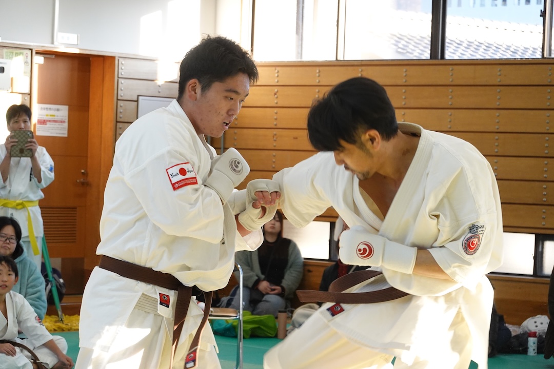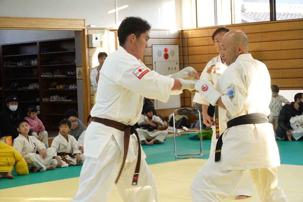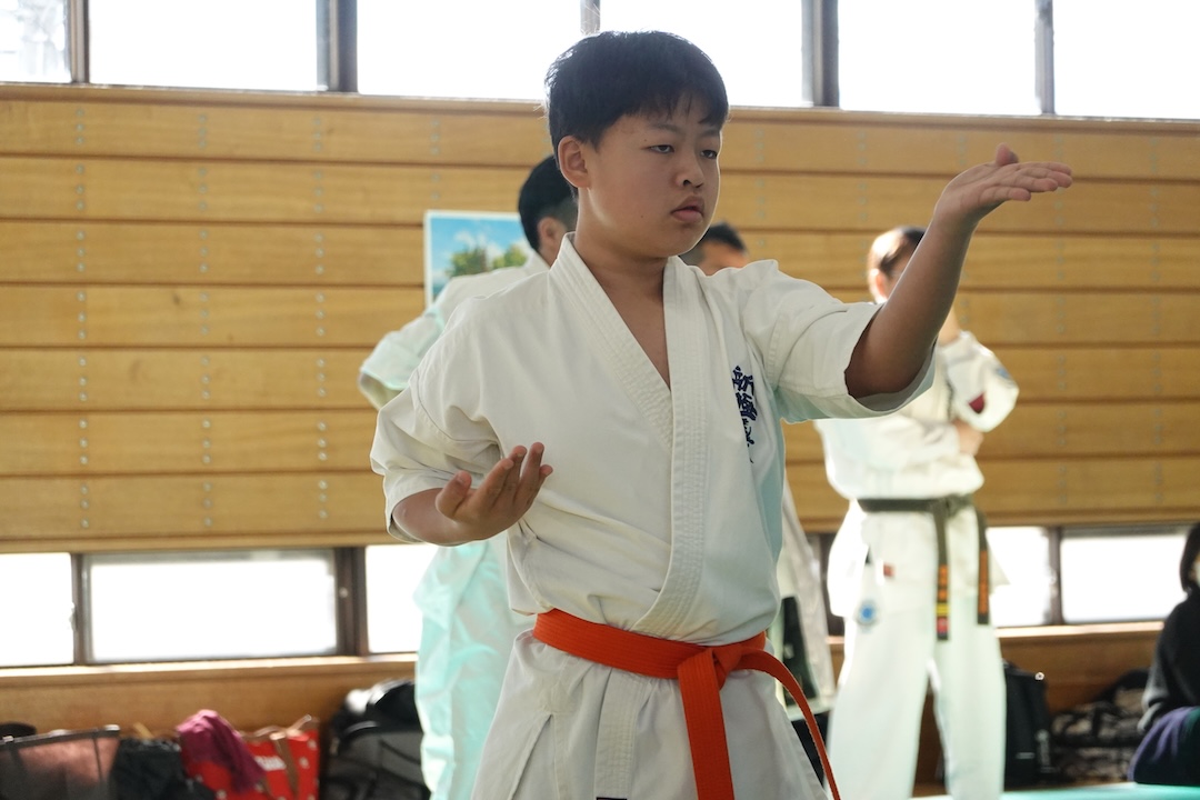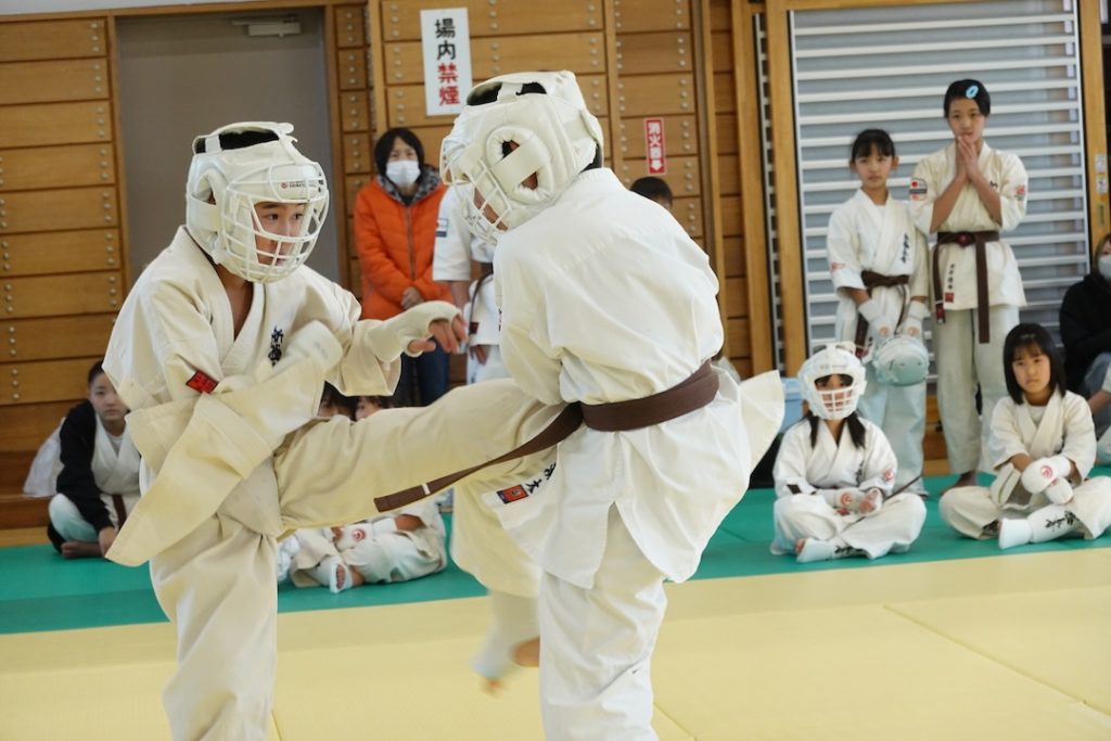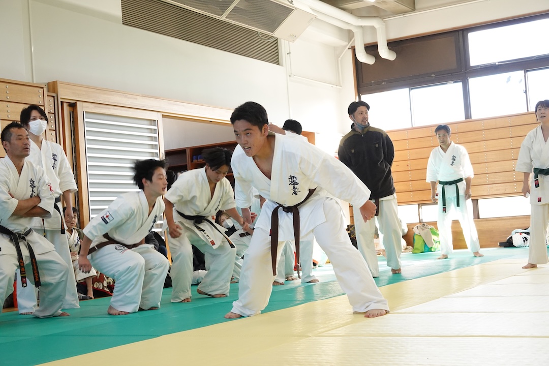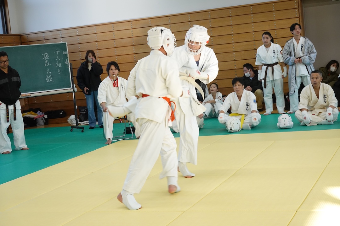 二人は日々の稽古の成果を存分に発揮、藤森玄毅は重量級らしい重厚な組手で、竹内碧は十分なスタミナを活かし、手数、足を最後まで止めることなく10人組手を完遂しました。